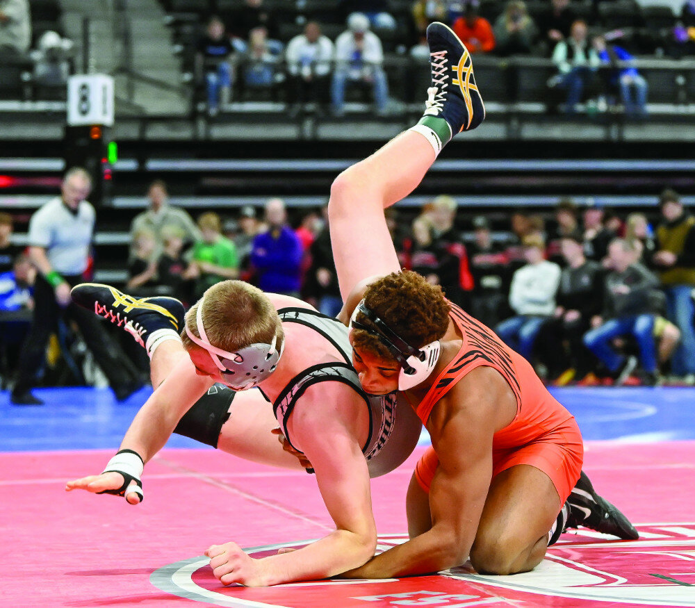 Cons. Round 2 – Tyce Huber (Huron) 2-4 won by fall over Isiah Brown (Rapid City Stevens) 3-4 (Fall 2:55)