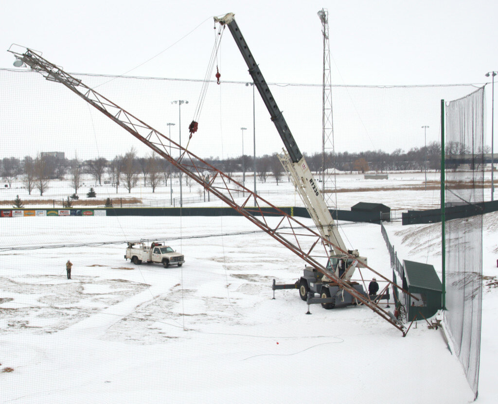 The cry Play Ball may be months away, but work on improving the lights at Memorial Ball Park began Tuesday, as the legs of the infield light standards were cut and the tall towers removed. Other towers are to be removed, with replacements set to arrive later this winter, and new lights are expected to be ready for the first pitch this spring.