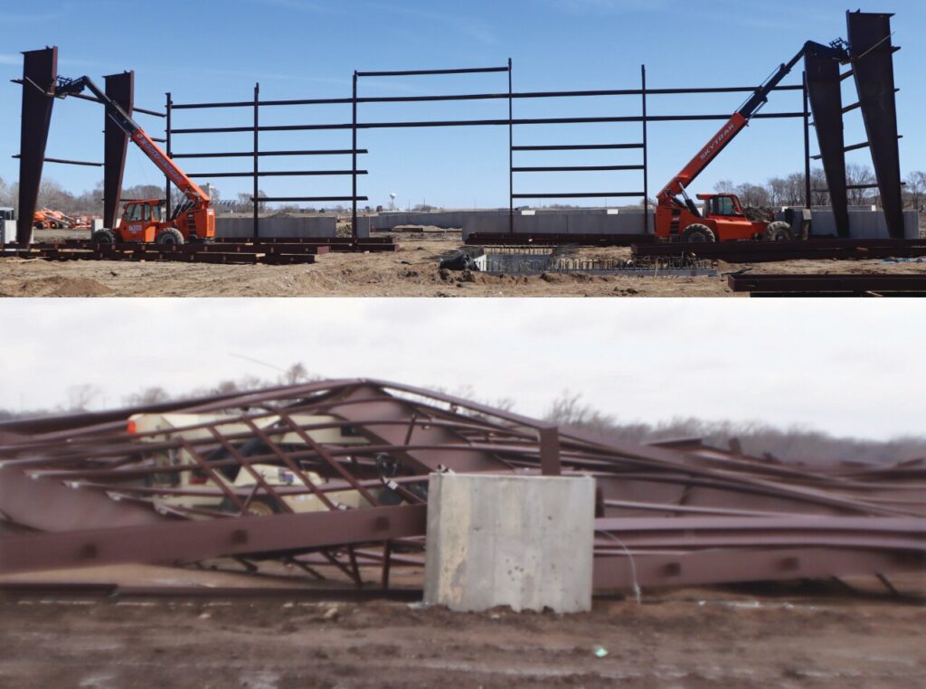 The heavy winds with Monday evenings storm caused the steel beams that had been placed for the new solid waste transfer station to collapse.