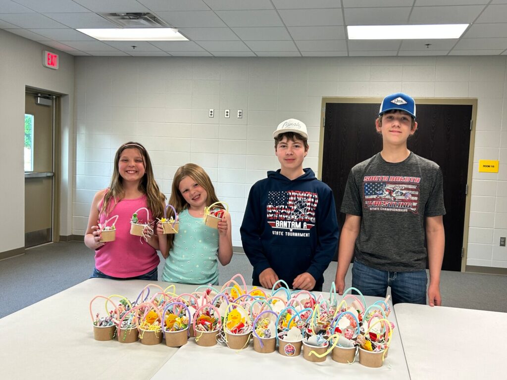 The Prairie Wranglers 4-H Club participated in their monthly community service project for the month of May by making over 50 individual candy baskets. The club delivered them to the Huron Senior Center for the local residents to enjoy.