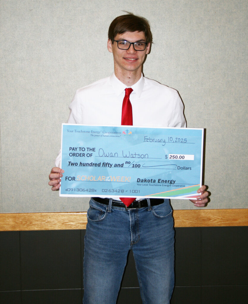 As a Scholar of the Week, Watson will be featured in a weekly segment on Dakota News Now and will receive a scholarship from Dakota Energy Cooperative. Watson is also now eligible to receive a $1,000 scholarship or one of two $500 scholarships that will be given away this spring at the annual Scholar of the Year banquet.