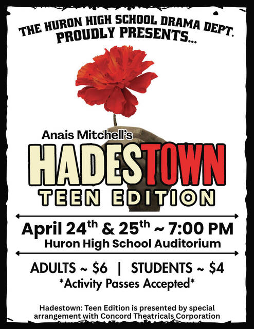 The Huron High School Theatre Department is proud to announce their upcoming production of “Hadestown: Teen Edition”, written by Anaïs Mitchell and produced with special arrangement with Concord Theatricals. Performances will be held Friday, April 24, and Saturday, April 25, at 7 p.m. in the Huron High School Auditorium. Tickets are $6 for adults and $4 for students, with activity passes accepted. Tickets are available at the door, and seating is on a first come first served basis.